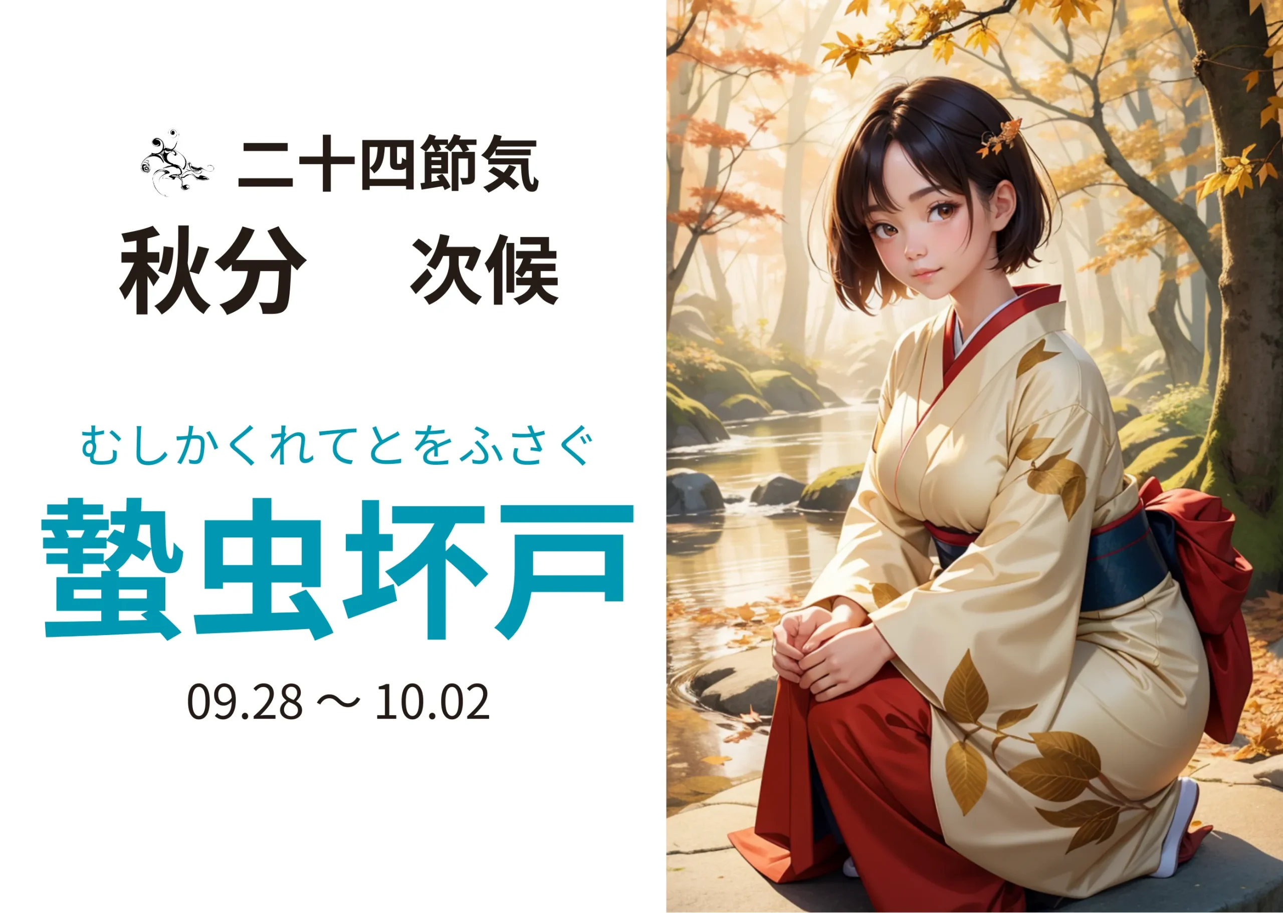 二十四節気 秋分の次候、蟄虫坏戸(むしかくれてとをふさぐ)は、9月28日 〜 10月2日あたりになります。