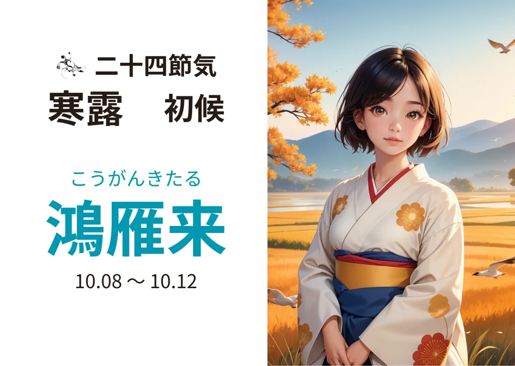 二十四節気 寒露の初候、鴻雁来(こうがんきたる)は、10月8日 〜 10月12日あたりになります。