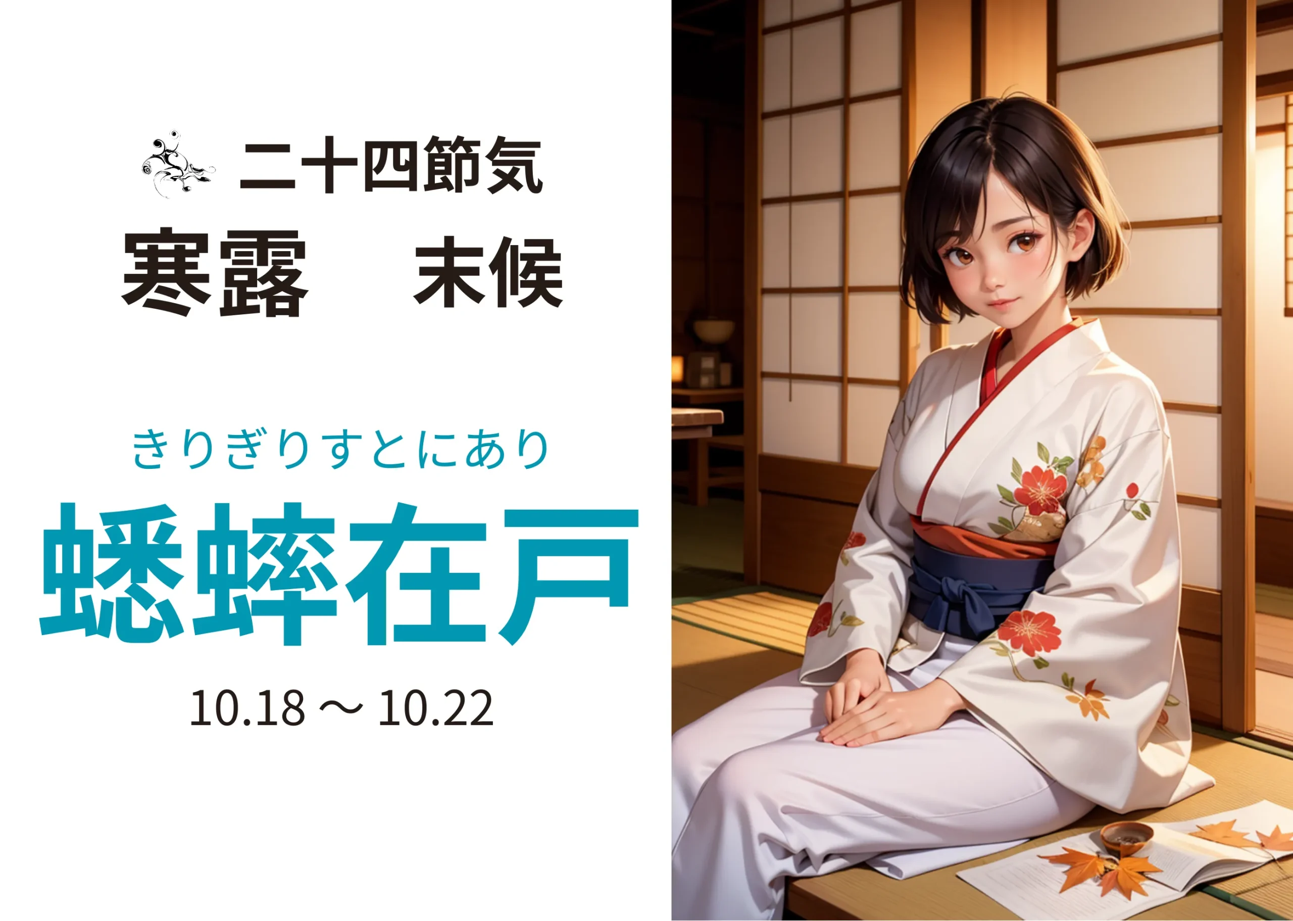 「こおろぎが戸口にいる」という意味です。野原で鳴いていたこおろぎたちが、肌寒さを感じて家の軒先や戸口近くへ移動してくる季節を表しています。