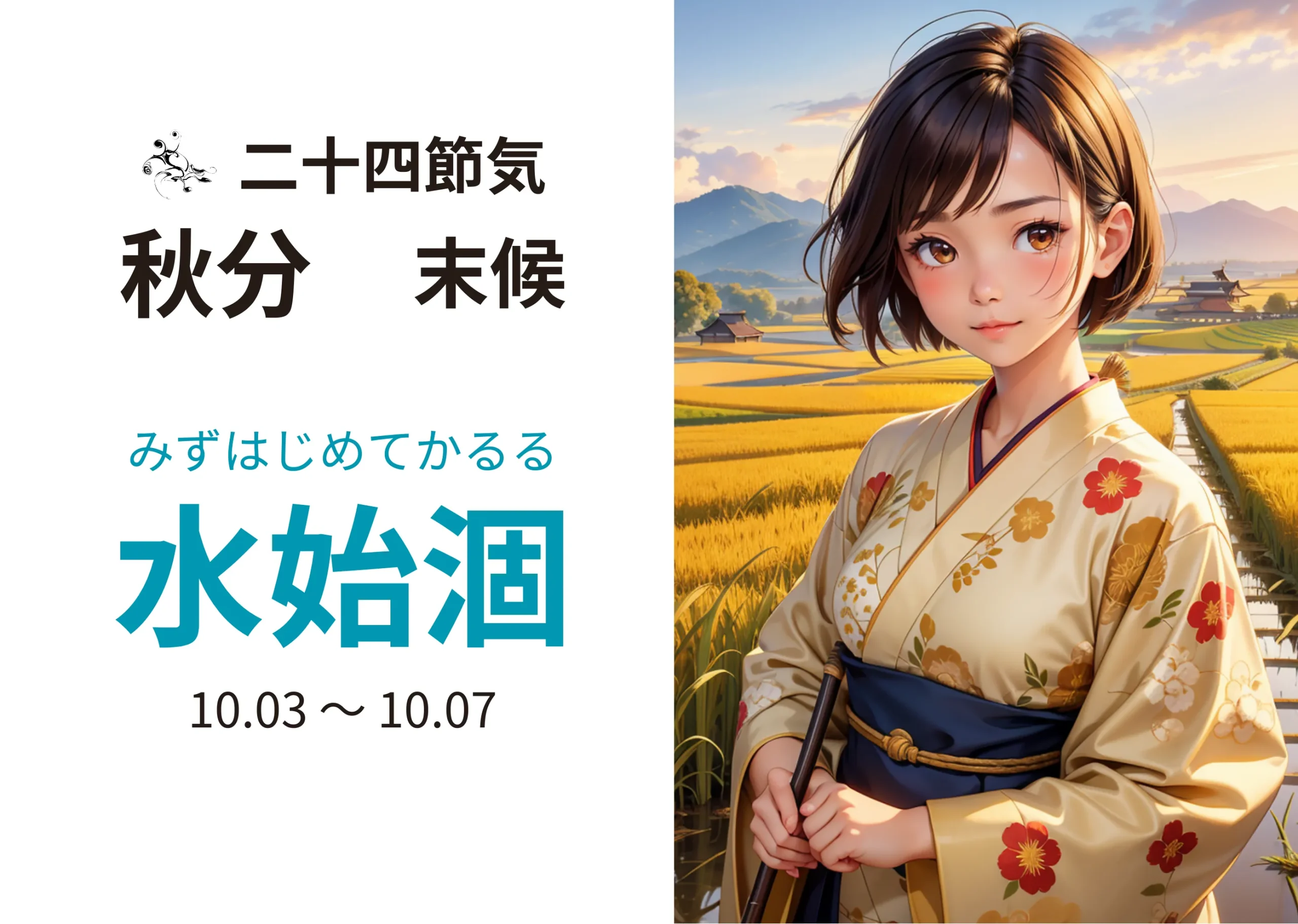 二十四節気 秋分の末候、水始涸(みずはじめてかるる)は、10月3日 〜 10月7日あたりになります。