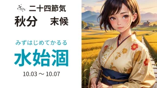二十四節気 秋分の末候、水始涸(みずはじめてかるる)は、10月3日 〜 10月7日あたりになります。田んぼの水を抜いて稲刈りの準備を始める時期を意味します。稲の収穫を目前に控え、田の水が引かれ、稲穂が黄金色に揺れる風景が広がります。かつての農村では、自然と共に暮らす人々が一年の恵みに感謝しながら、刈り入れの準備に追われる大切な節目です。気候も次第に秋の深まりを感じさせ、朝晩の冷え込みが強まってくる時期でもあります。自然と人の営みが調和する、美しい日本の原風景を感じられる季節です。