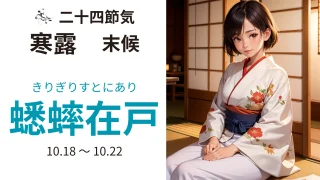 二十四節気 寒露の末候、蟋蟀在戸(きりぎりすとにあり)は、10月18日 〜 10月22日あたりになります。「こおろぎが戸口にいる」という意味です。野原で鳴いていたこおろぎたちが、肌寒さを感じて家の軒先や戸口近くへ移動してくる季節を表しています。夜になると、静かな空間に響くこおろぎの声が、秋の深まりと少しの物寂しさを感じさせます。虫の音に耳を傾けながら、過ぎゆく季節を慈しむ、そんな日本人ならではの情緒が息づく時期です。